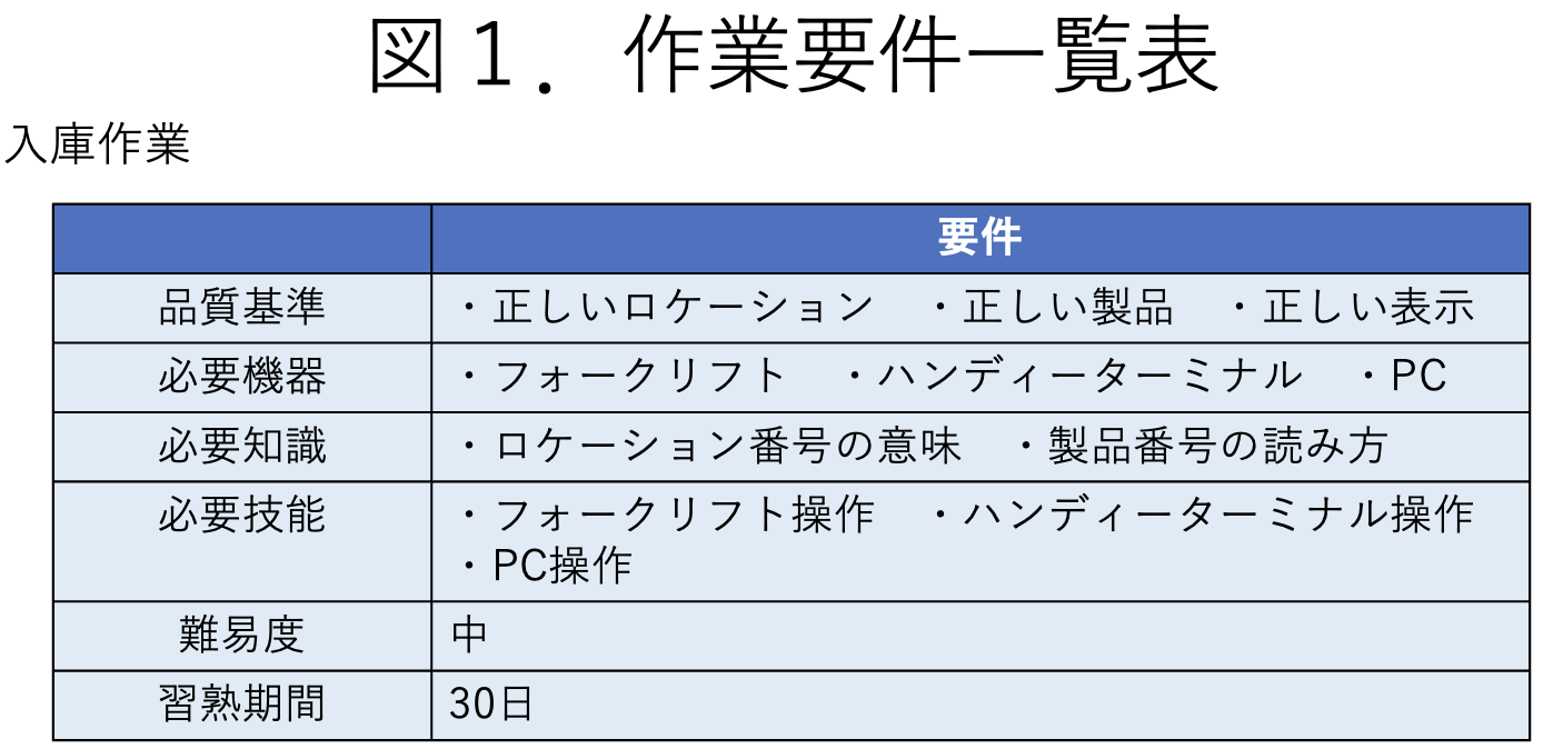 入庫作業の標準作業を設定する場合、図2のような例が考えられる。この図の内容を補足するものとして「フォークリフト取り扱い基準(以下、基準)」を挙げたい。パレットに積まれた部品等を棚入れする際にはフォークリフトを使うことになる。その際に細かなフォークリフト取り扱いのステップを入庫作業の標準作業に入れるよりも、別に基準を定め、そこに必要情報を集約して入れておくことをお勧めする。基準を定めたうえで、フォークリフトの注意事項はそちらを参照するように記しておこう。
