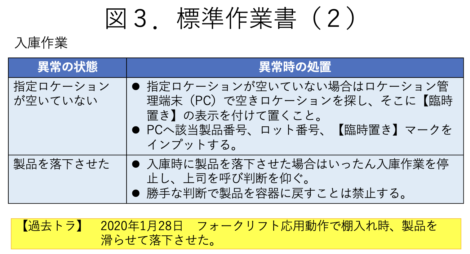 2つ目に「製品を落下させた」という異常。ちょっとした落下は何気なく元の容器に戻してしまうことがある。これは製品品質不良につながる可能性がある危険行為だ。このようなケースでは作業者自身が判断せずに、上司を呼んで判断を仰ぐことを対処方法としてルール化するとよいだろう。