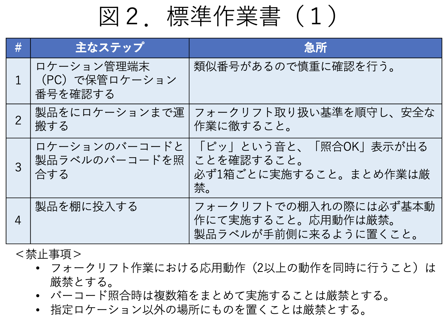 • 入庫時に誤投入してしまうとそれが誤出荷までつながってしまうことがあり得る。入庫時の品質保証には細心の注意を払った標準作業を確立したい。