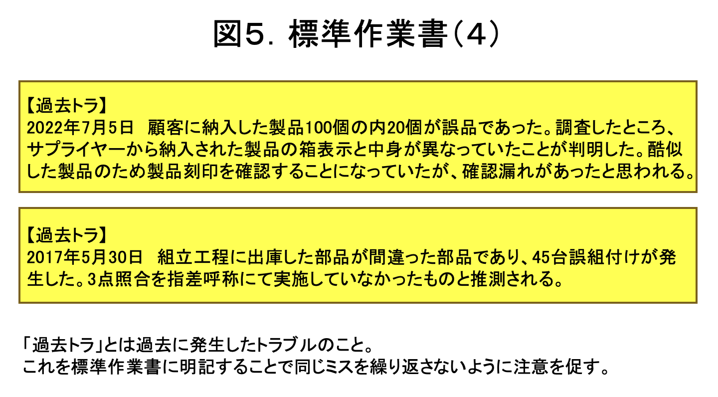 製品そのものにバーコードなどの識別が入っていればそれを出庫伝票や出庫ラベルなどと照合することで誤品はほぼ避けることができる。しかし大多数の工場では目視による識別を行っているため、正しい製品であることを確実に担保できる標準作業を設定することが求められる。場合によってはサプライヤーから納品されたものである場合、そのもの自体が箱の表示と異なる場合がある。入荷時点ですべて箱の中身まで検品を行っていないケースが多いと考えられるので、出庫時に確認することが必要。オーダーリストと製品ラベル、製品刻印の3点照合を指差呼称にて確実に実施することを標準作業として定めておこう。