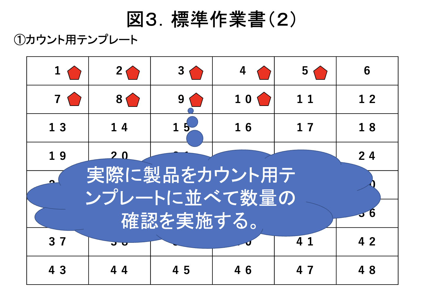 正しく数えることは簡単ではない。こういうと首をかしげる人がいるが、物流経験者であれば身に染みて実感していることだろう。誤数を避けるためにはトレーに一度製品を並べて指差呼称にて数量を確認したり、カウント用テンプレートを指定し、それを必ず使用したりすることを定めておこう。併せて20個以上の場合には必ず5個単位で数量カウントを実施するといったルールもお勧めだ。