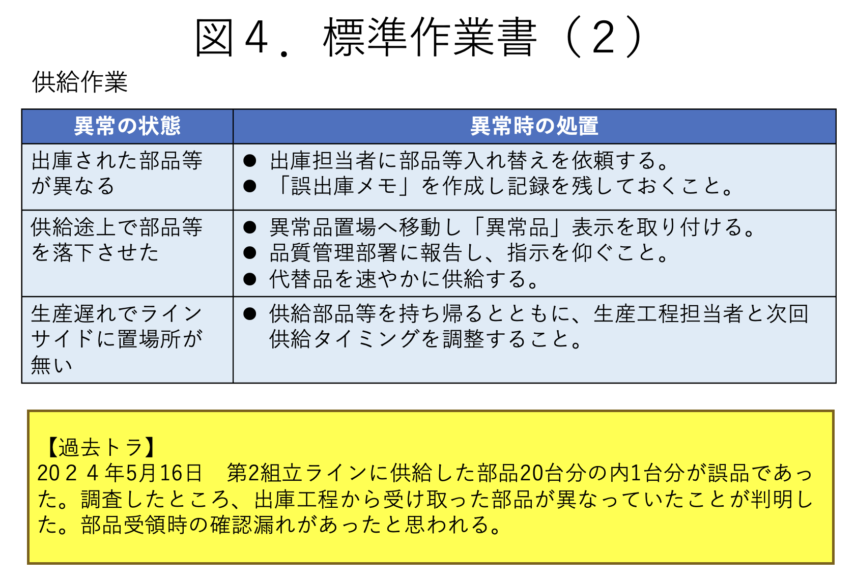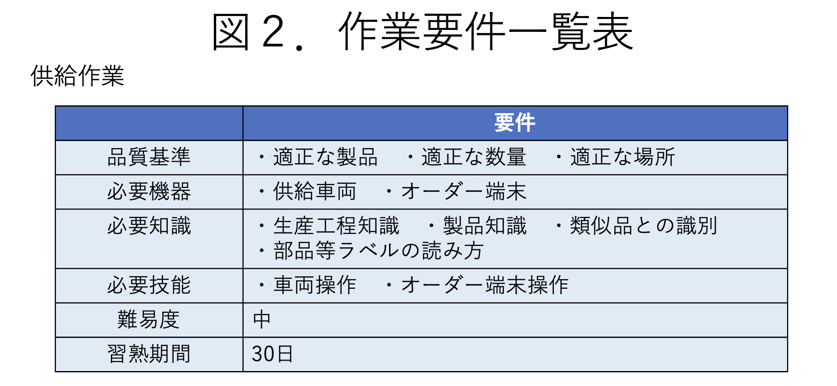 - 供給作業とは倉庫から出庫された部品や資材を生産工程に届ける作業をいう。