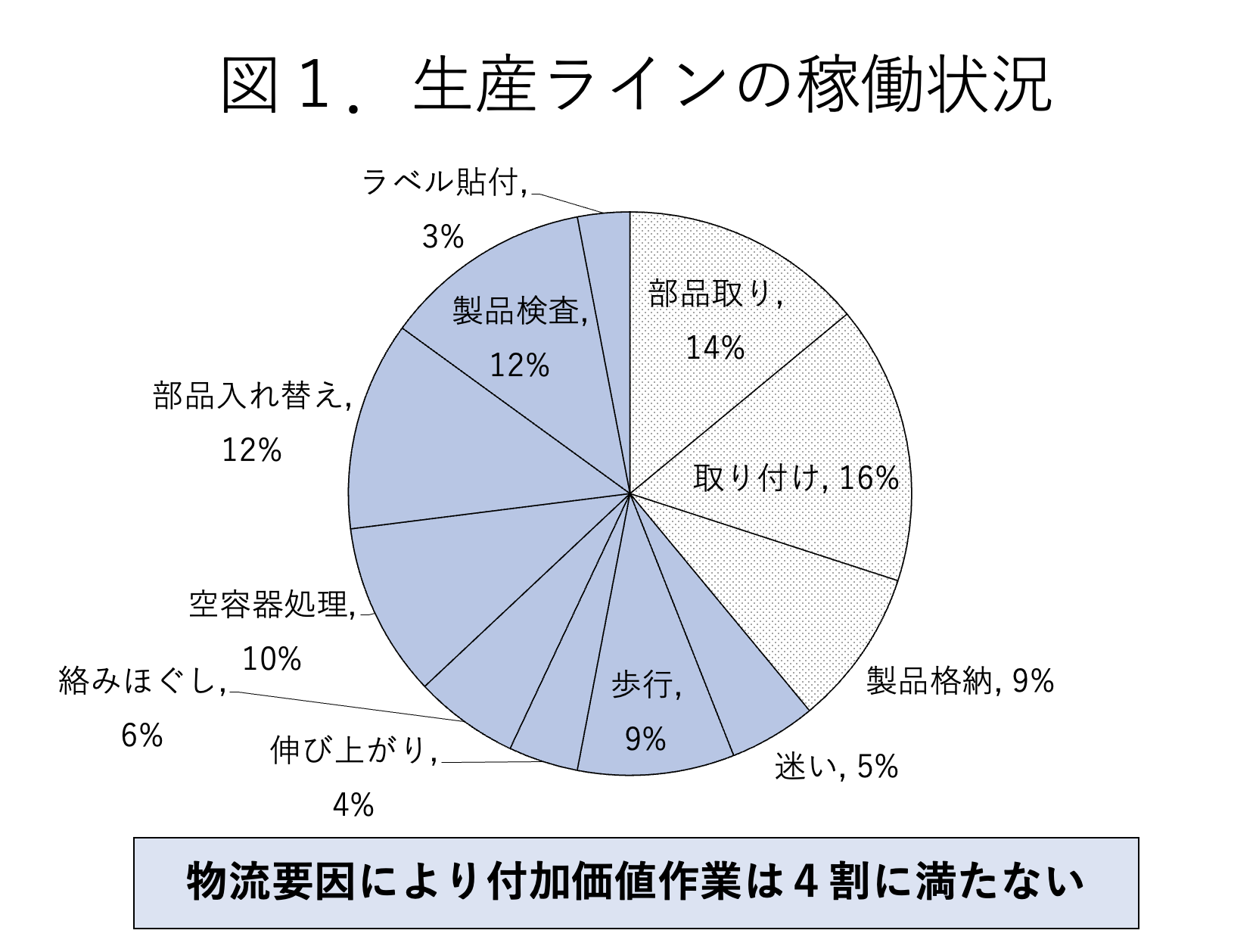 部品メーカーや資材メーカーから納入された荷姿のまま生産工程に供給しているケースを見かけるが、これも生産工程でのムダ発生要因となる。たとえば容器の奥に置かれている部品等を取る時に伸び上がりが発生したり、部品等同士が絡み合っているものをほぐしたりといった余分な動作が発生する可能性がある。ひどいものになると、部品等を使い終わった後に発生する空容器と新たな部品等の入った容器とを入れ替えるような作業が発生している(図1)。結果的に生産工程の付加価値作業比率が40%に満たない工場も少なくない。せめてこの比率は70%以上に引き上げたいところ。